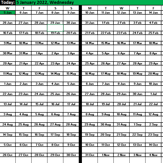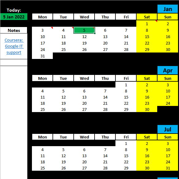 This is an excel sheet with 2022 template for planning and note taking in excel. Black background excel sheet.